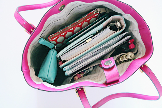 Yet my tote never feels over-filled. And with everything organized in categorized pouches that act like "bins", everything is quick and simple to pull out and find. And ditto to putting things back. I love when I don't have to dig to the bottom of the black hole that is my purse when I am trying to get somewhere or I am in need of a specific item. Digging and rummaging are two activities that my heart doctor recommends I avoid (not really, but he probably should).