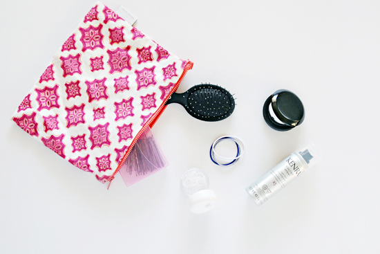 Another great pouch to keep handy in the car or when out for a long and busy day; this pouch contains a small brush, mirror, hair clips and ties and a small hairspray. I would also toss a travel size dry-shampoo into the pouch to keep my locks looking fresh all day long.