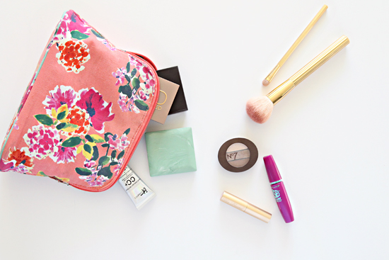 I find that I like to do my makeup in different places, depending on how my day is going. I typically do it at my vanity, but if I am waiting for company, I take it up to our main bathroom. And if we have somewhere to be, I do it in the car. Keeping my favorites in a pouch allows me to do it wherever I wish.