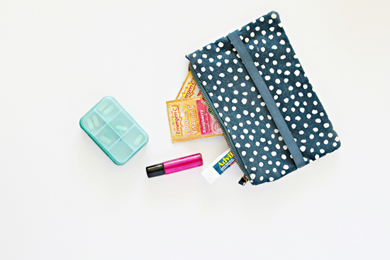 Not everything has to be a kit! Sometimes I just keep all of the smaller bits and pieces together in a single pouch to keep everything from becoming tossed around at the bottom of my bag. Some of my favorite items to take with me everywhere are a mini-tape measure, nail clippers, headache oil, face powder, business cards, hair ties/clips, gum and lip care.