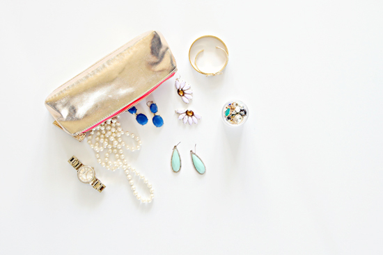 Another way that I utilize pouches while traveling, is to keep all of my jewelry together. Smaller earrings are held by a cosmetic container while the remainder of the items are tossed into the pouch and into my suitcase (I will use a jewelry roll when traveling with nicer/valuable jewelry or for longer trips).