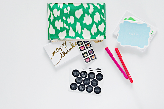 I am a believer in leaving little notes while traveling (thank you's when traveling for business and for housekeeping at hotels, a quick hello when away for a few days and notes of encouragement when someone least expects it). A pouch is the perfect place to keep a small stack of cards, stamps, stickers and writing supplies.