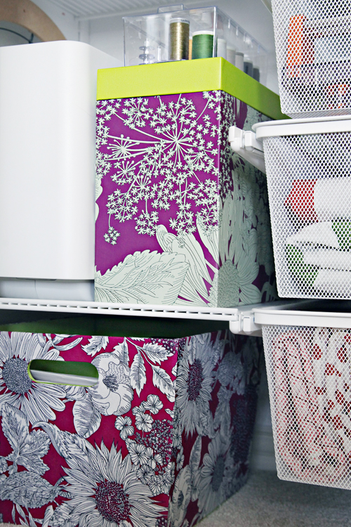 Above the sewing machine, clear bins were stacked. The items used frequently (adhesives, punches, etc...) were placed at Cassie's main level while less used items went on the upper shelves.